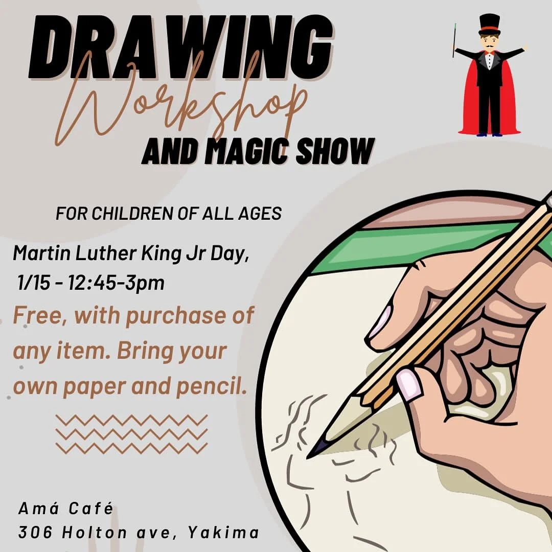 At any rate; please join the children this Monday for a Drawing Workshop in observance of Martin Luther King Jr. Day between 12:45pm-3:00pm. FREE with the purchase of any item; courtesy of the wonderful staff at AMA Cafe!